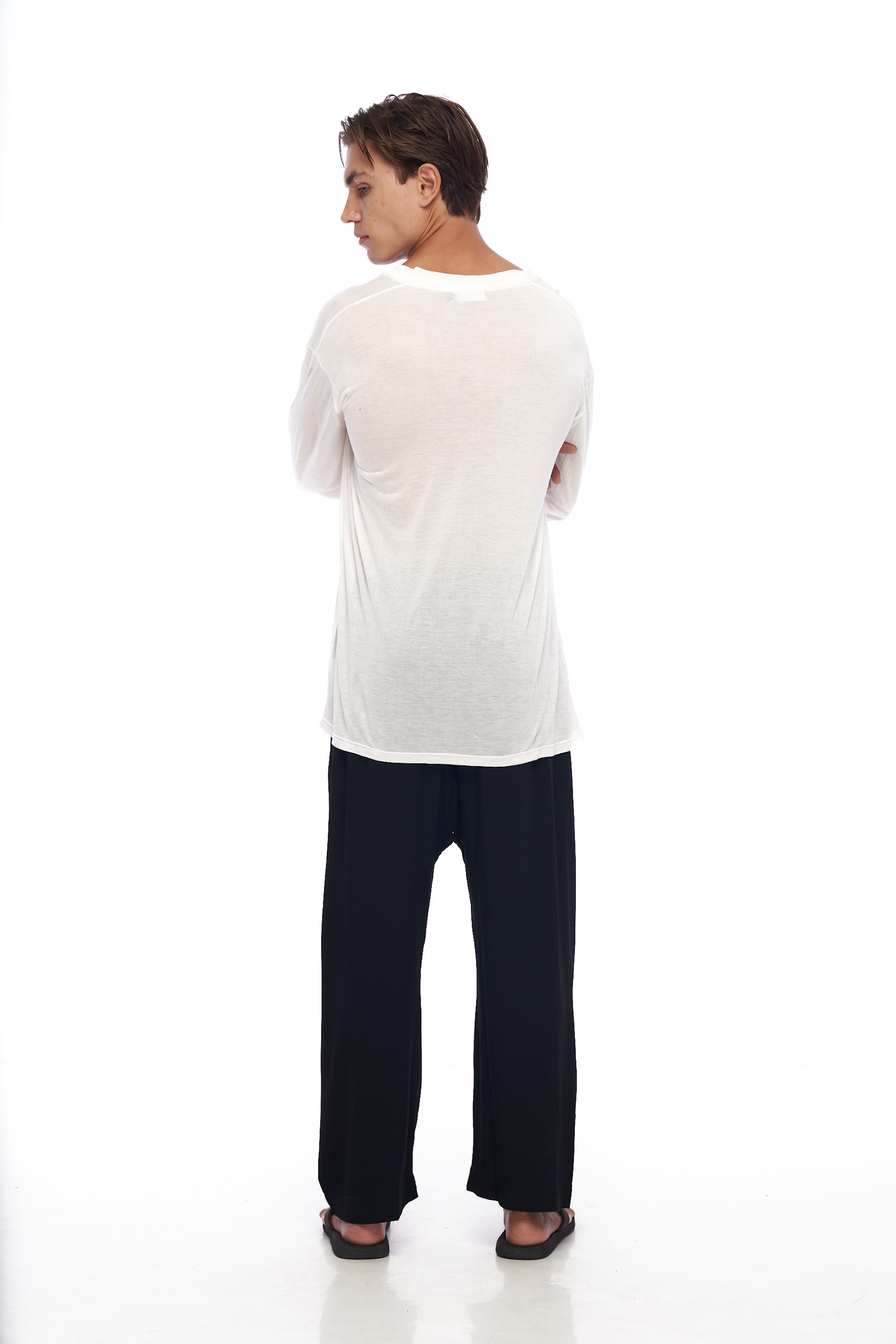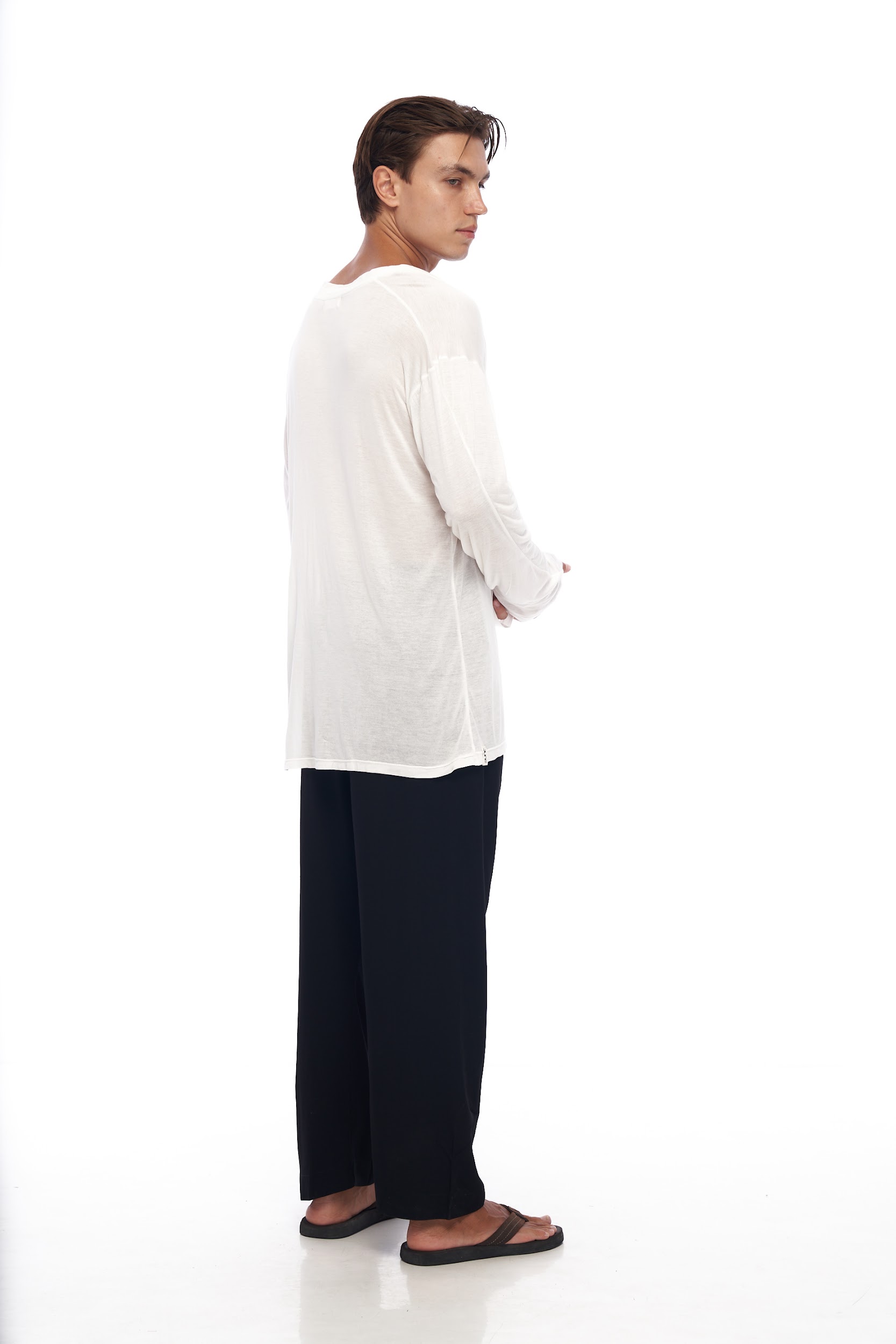 Camiseta moda cómoda. Con bajo redondeado, cuello de pico amplio y manga larga para recoger sobre el brazo